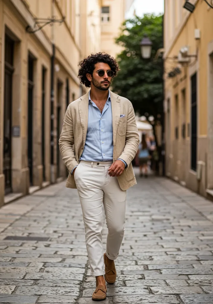 This outfit feels breezy and confident, featuring a light beige blazer layered effortlessly over a pale blue shirt. White trousers and suede loafers keep the look sharp yet relaxed, while the pocket square tucked neatly adds a hint of elegance. Walking through a cobblestone street, he radiates an air of casual luxury that feels perfectly Mediterranean.