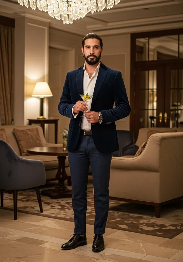 This outfit brings luxury into focus. A velvet navy blazer paired with slim tailored trousers and a crisp open collar shirt makes the look both bold and approachable. The polished black shoes and a martini glass in hand complete the picture of refined evening glamour under the chandelier light.