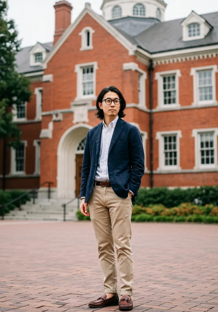 This look is clean, simple, and undeniably classic. A navy blazer worn over a white oxford shirt, paired with beige chinos and brown loafers, creates that timeless prep school energy. His long hair and glasses add a modern touch, making the outfit look approachable while still rooted in tradition.
