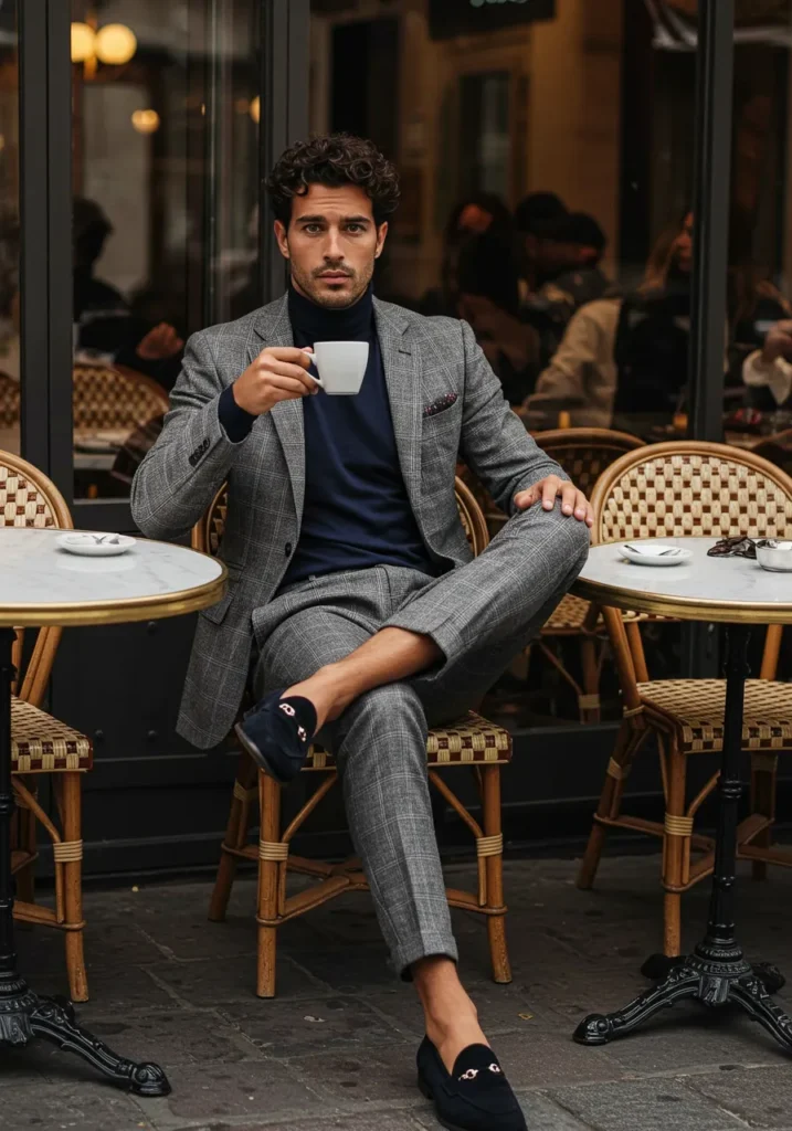 I find this look irresistible because it blends comfort with polish. A turtleneck under a check blazer feels unexpected but stylish, and sipping coffee in this outfit just feels so right. To me, this is classic Parisian chic for men.