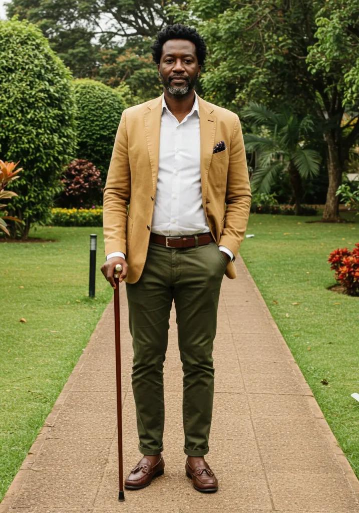I like this one because it’s stylish without being loud. The muted colors keep it grounded, while the cane adds personality. Honestly, it’s the kind of outfit that says he enjoys the finer things without ever needing to brag.