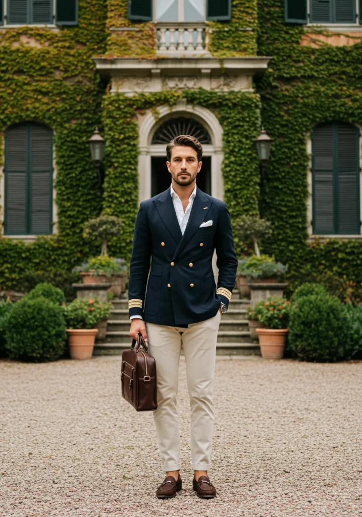 This look channels pure heritage charm. The double breasted navy blazer with gold buttons and cuff detailing feels commanding yet refined. Paired with a crisp white shirt, light trousers, brown loafers, and a structured leather briefcase, the outfit is the definition of old money confidence against the ivy covered mansion backdrop.