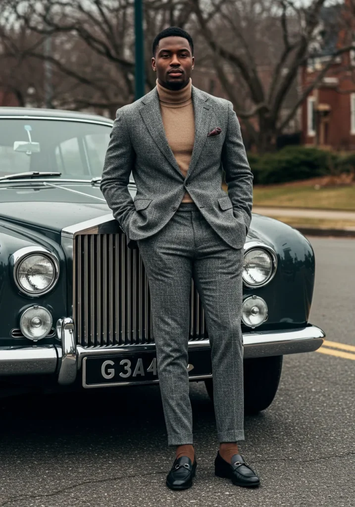 The soft camel turtleneck paired with a tailored grey blazer and trousers creates such a sleek and unexpected twist on classic tailoring. Black loafers and a pocket square complete the refined look, and the pose in front of a vintage car seals the impression of understated luxury. It’s old money charm with a hint of modern boldness.