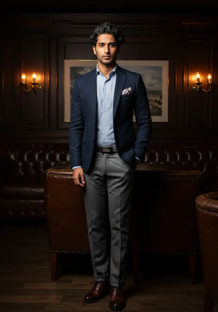 The navy blazer here feels perfectly tailored, paired with a pale blue shirt and refined grey trousers. Brown oxford shoes and a subtle patterned pocket square elevate the look while the dimly lit leather interior behind him adds a classic, club-like ambiance. It’s sleek and sophisticated in every sense.