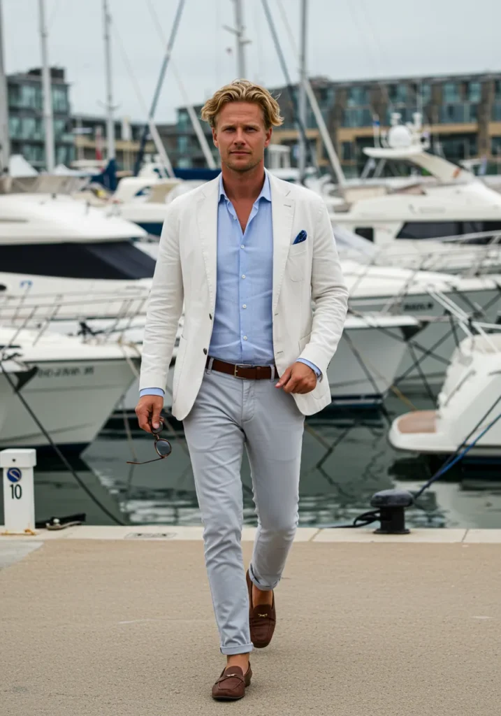 A crisp white blazer steals the spotlight in this outfit, styled with a pale blue shirt and light grey trousers. Brown loafers and a pocket square add a touch of warmth, while sunglasses in hand hint at a relaxed, yacht-side lifestyle. The boats in the background only enhance the refined, vacation-ready energy.