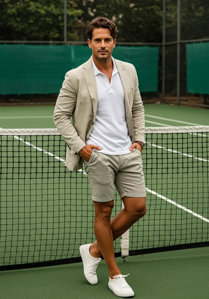 This outfit brings a playful twist to blazer styling. A beige blazer sits comfortably over a white polo shirt, paired with tailored shorts in the same tone for a sleek monochrome effect. White sneakers keep the look sporty, while the tennis court backdrop reinforces the casual yet refined lifestyle vibe.