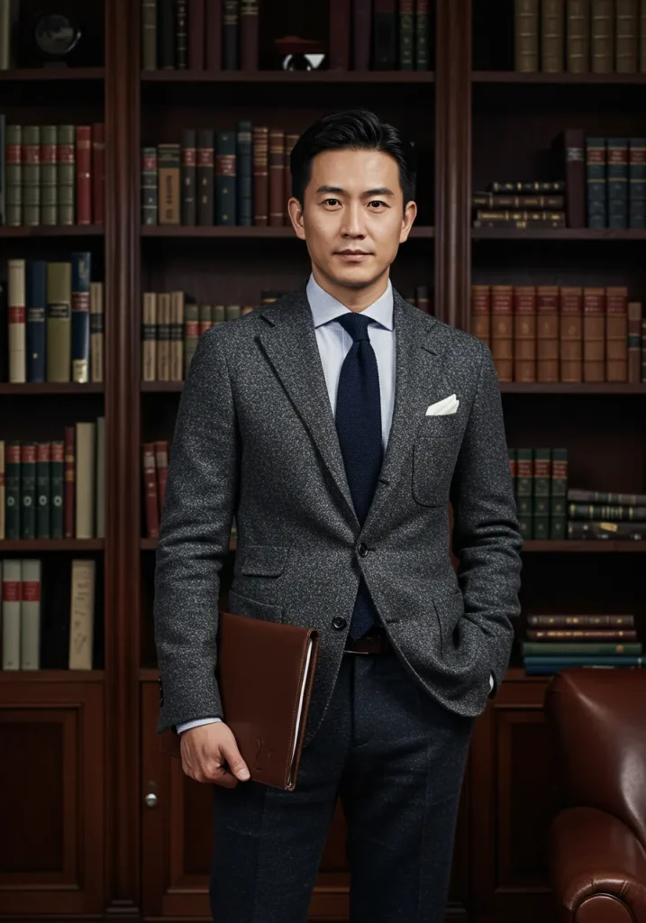 This look is all about timeless sophistication. A tailored grey blazer is paired with a crisp light blue shirt and navy tie, finished with a white pocket square for just the right touch of polish. The darker trousers balance the outfit perfectly, while the leather folder in his hand hints at a life filled with important meetings and smart decisions. The background of rich wooden bookshelves adds even more depth to the refined old money feel.