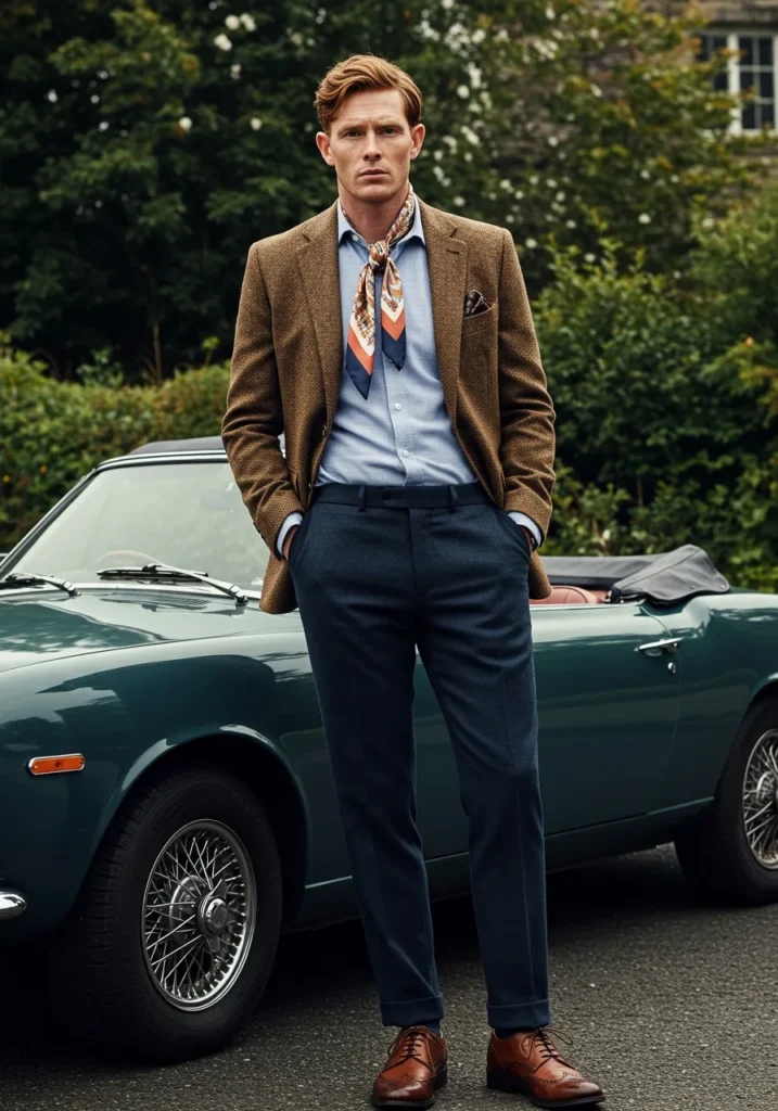 Here we have a handsome mix of textures and tradition. The brown tweed blazer paired with a pale blue shirt and navy trousers feels distinctly British, but it’s the patterned silk scarf knotted at the neck that makes it pop. With polished leather brogues and a vintage car behind him, the entire look nods to countryside sophistication.
