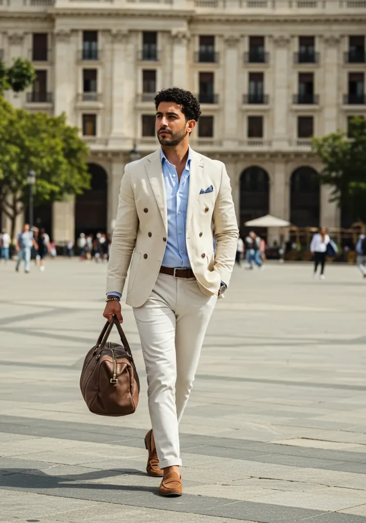 This ensemble is polished yet relaxed, featuring a cream double breasted blazer layered over a light blue shirt. The tailored white trousers and tan loafers create a sleek silhouette, while the large brown weekend bag in hand hints at a lifestyle filled with elegant city escapes. The soft pocket square adds just the right touch of detail.