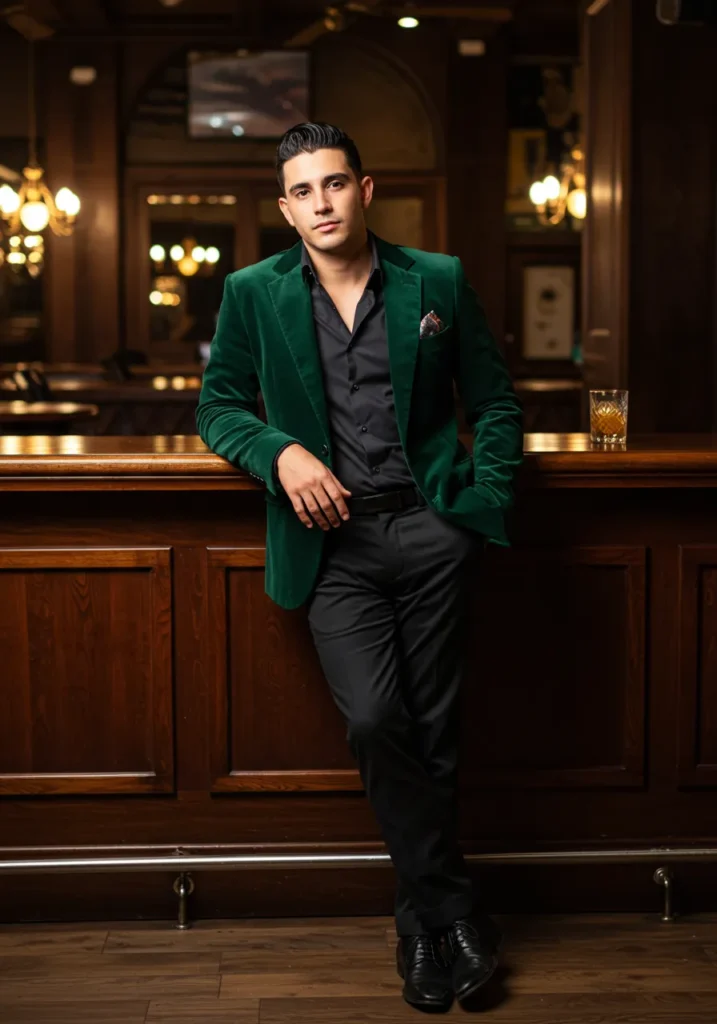 This outfit leans into evening elegance with a green velvet blazer over a black shirt and trousers. The pocket square adds a small but stylish detail, while the casual stance at the bar makes the whole look relaxed yet refined.