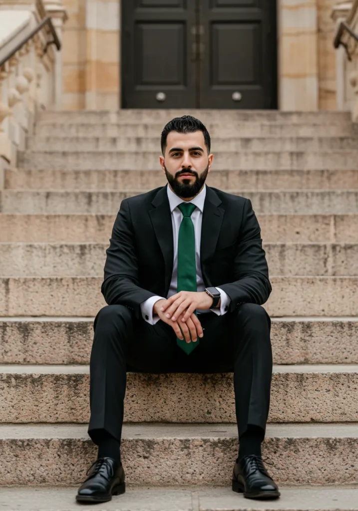 This outfit pairs a classic black suit with a bold green tie, striking a perfect balance of tradition and statement. The polished shoes and neat grooming give it that refined finish, while the stone steps backdrop adds to the timeless look.