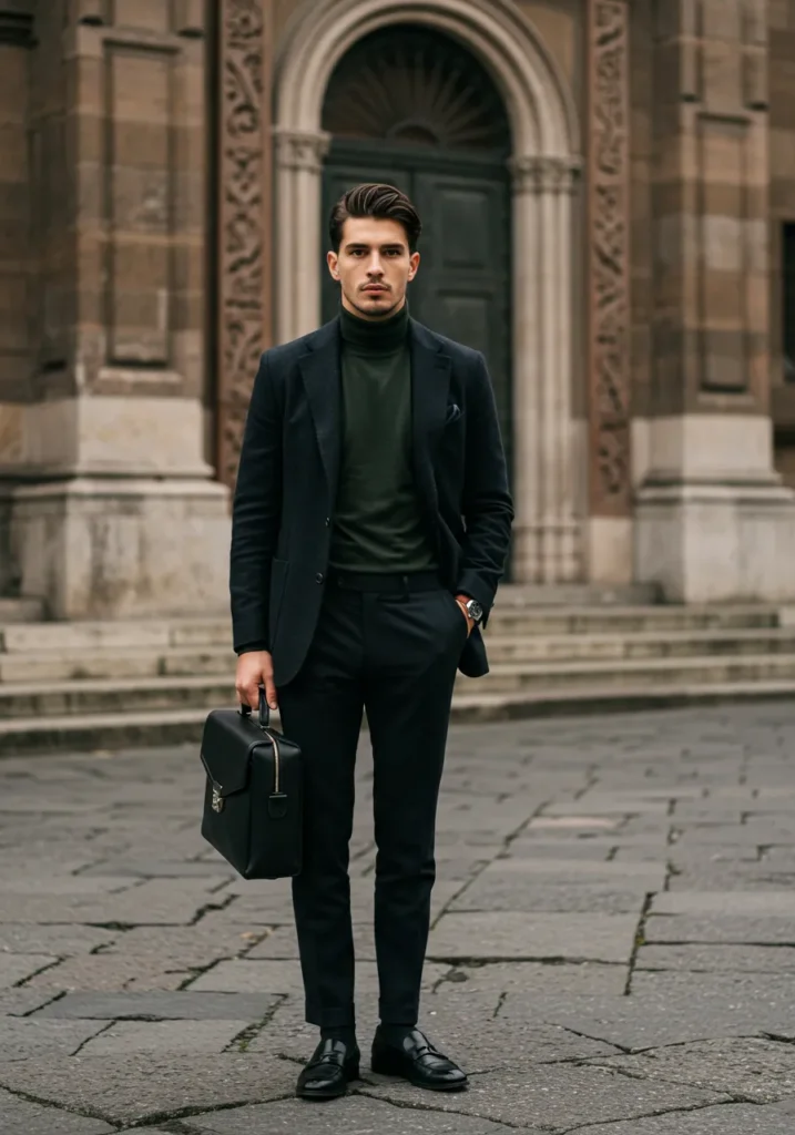 This outfit takes sleek tailoring and softens it with a dark green turtleneck. The black blazer and slim trousers keep the look sharp, while the leather briefcase and polished loafers add a professional edge. Standing in front of grand stone architecture makes the whole scene even more striking.