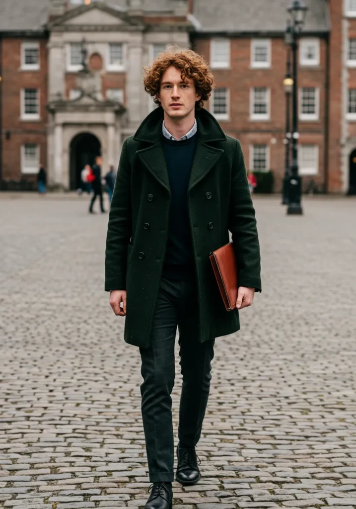 Here’s a look that feels smart and approachable at the same time. A forest green overcoat layered over a black sweater and trousers creates a classic palette, while the brown leather portfolio adds warmth and sophistication. The cobblestone backdrop ties it all into a timeless, old money vibe.