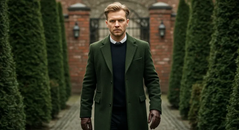 This outfit blends comfort and refinement seamlessly. A quilted forest green jacket is layered over a dark sweater and crisp shirt, styled with slim trousers and polished black boots. Walking along a country path with a loyal dog at his side makes the look feel warm and authentic.