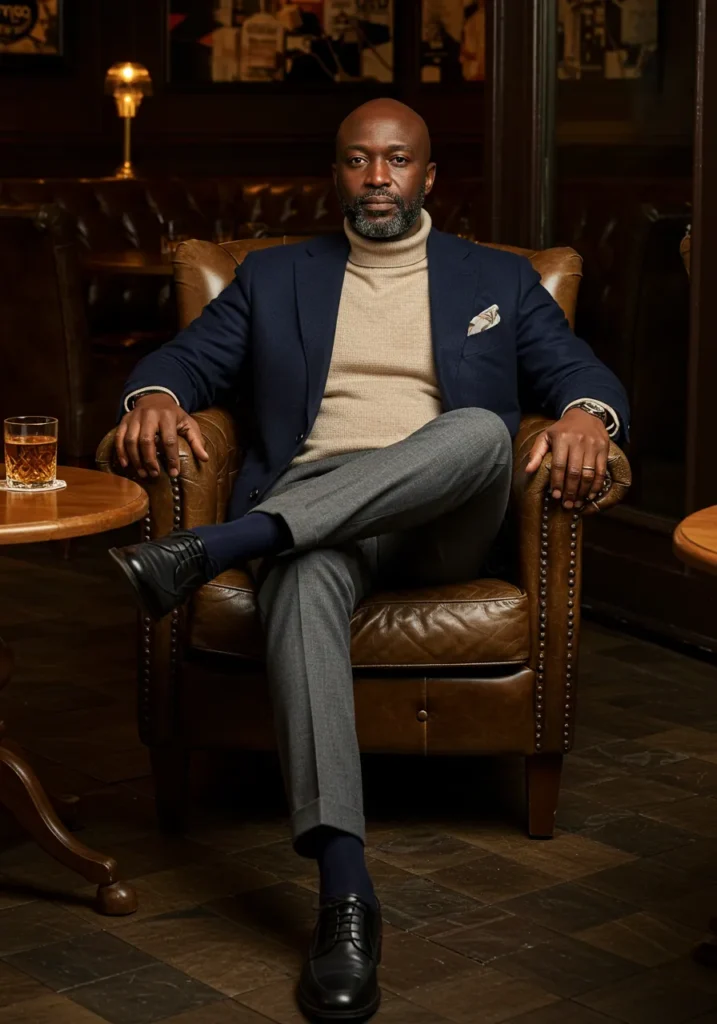 A navy blazer paired with a beige turtleneck and grey trousers feels warm, relaxed, and still very elevated. Black leather shoes and a pocket square add polish, while the leather armchair and glass of whiskey give it an atmosphere of pure refinement.