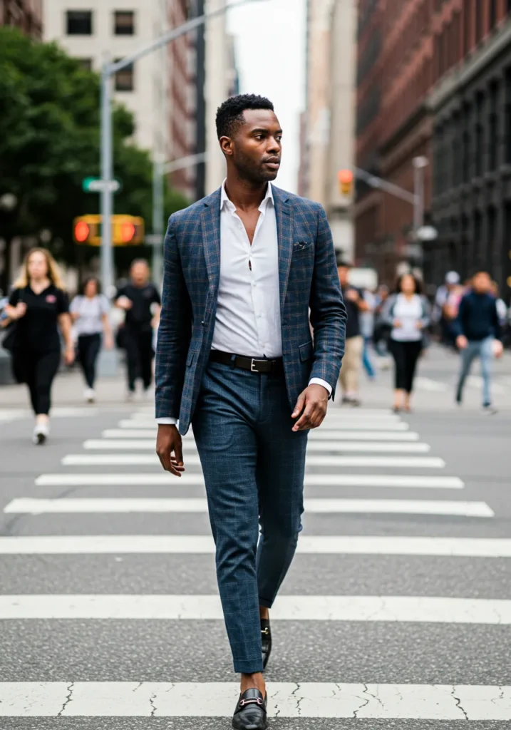 This look pairs a checkered blazer with slim tailored trousers in blue and a crisp open-collar white shirt. Black loafers finish it with polish, while the city street setting makes the outfit feel alive and modern.