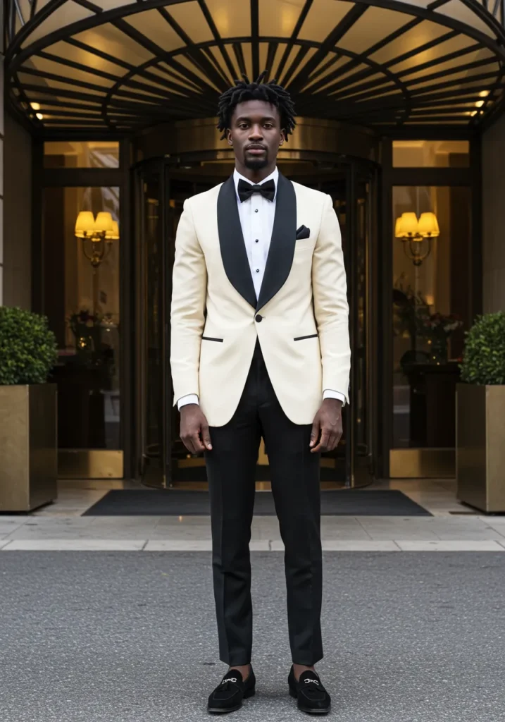 This tuxedo is striking in ivory with black lapels, paired with slim black trousers, a crisp white shirt, and a bow tie. Black loafers finish the outfit, and the hotel entrance backdrop gives it that glamorous energy.