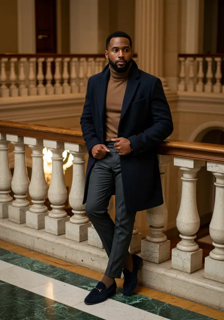 A navy overcoat layered over a camel turtleneck and grey trousers makes this outfit look understated yet incredibly sharp. Dark loafers keep it grounded, while the marble staircase background highlights the old money feel.