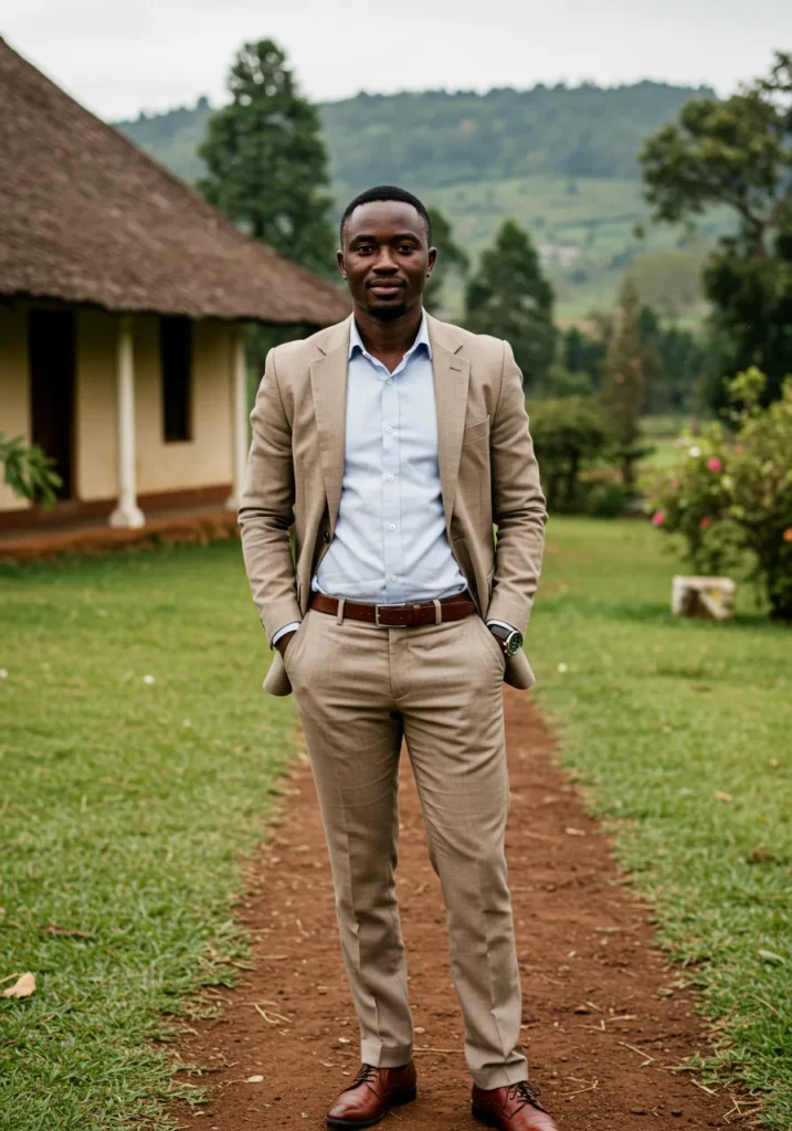 This look is a perfect mix of tailored elegance and relaxed charm. The tan suit is fitted just right, paired with a light blue shirt that adds freshness without needing a tie. Brown leather shoes and a matching belt ground the outfit, while the lush countryside backdrop makes it feel like effortless sophistication in nature.