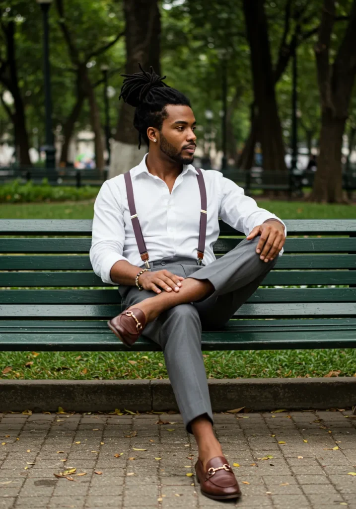 This outfit shows how boldness can also be understated. A crisp white shirt tucked into grey trousers is elevated with dark suspenders and polished loafers. The accessories are minimal but thoughtful, with a bracelet adding just a hint of character. Sitting casually on a park bench, he exudes effortless style.