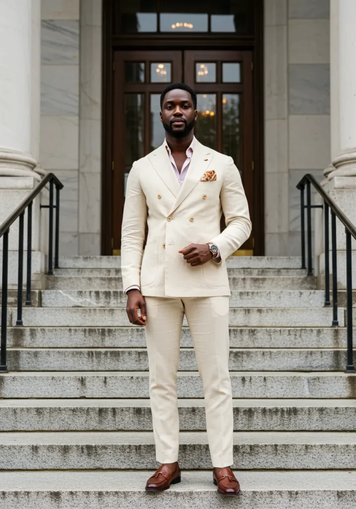 This outfit is the definition of bold sophistication. The cream double-breasted suit is perfectly tailored, worn with a light pink shirt that adds softness and personality. Brown loafers, a gold watch, and a silk pocket square in warm tones complete the look, while the grand staircase setting makes it feel powerful and refined.