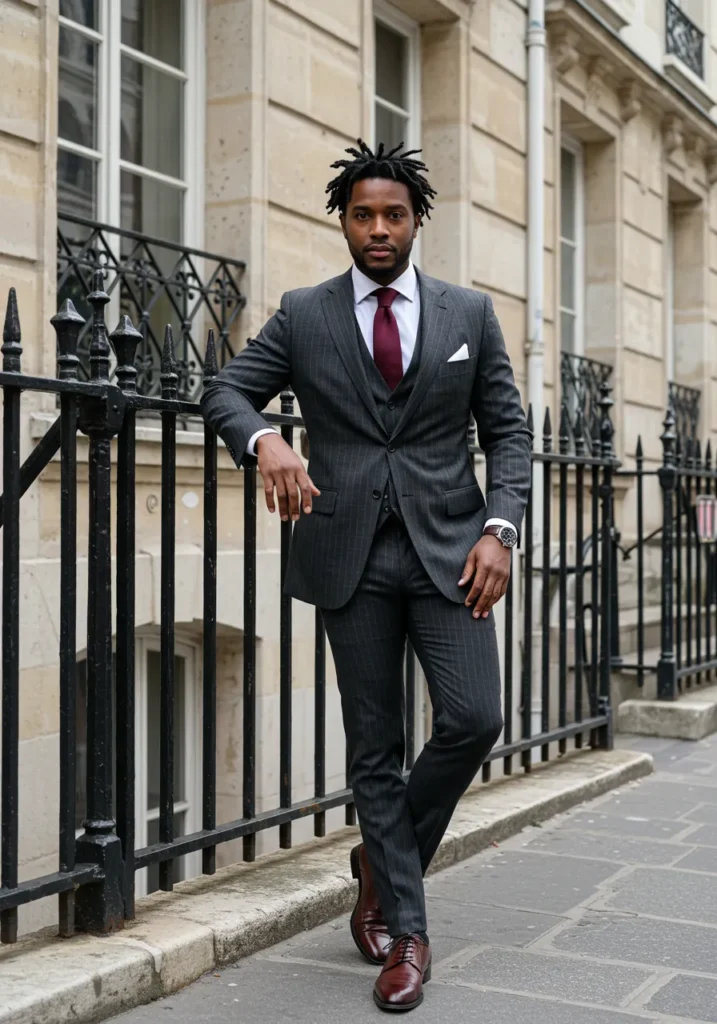 The classic pinstripe suit gets a fresh energy here. This three-piece look is anchored by a charcoal grey base, a crisp white shirt, and a bold burgundy tie that pops against the neutral tones. Brown leather shoes and a pocket square finish the outfit with all the right old money details.