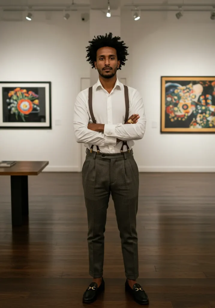 I think this look is such a clever way to show bold style without a loud suit. The suspenders make it feel retro and cultured, while the art gallery setting makes it clear he’s someone who appreciates refined taste. It’s smart, stylish, and quietly confident.