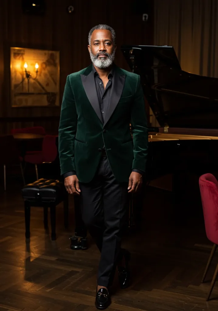 This outfit is pure richness. The emerald green velvet blazer with satin lapels is paired with an all-black base of shirt, trousers, and loafers. It’s the perfect example of how one bold color choice can elevate an entire look into something unforgettable.