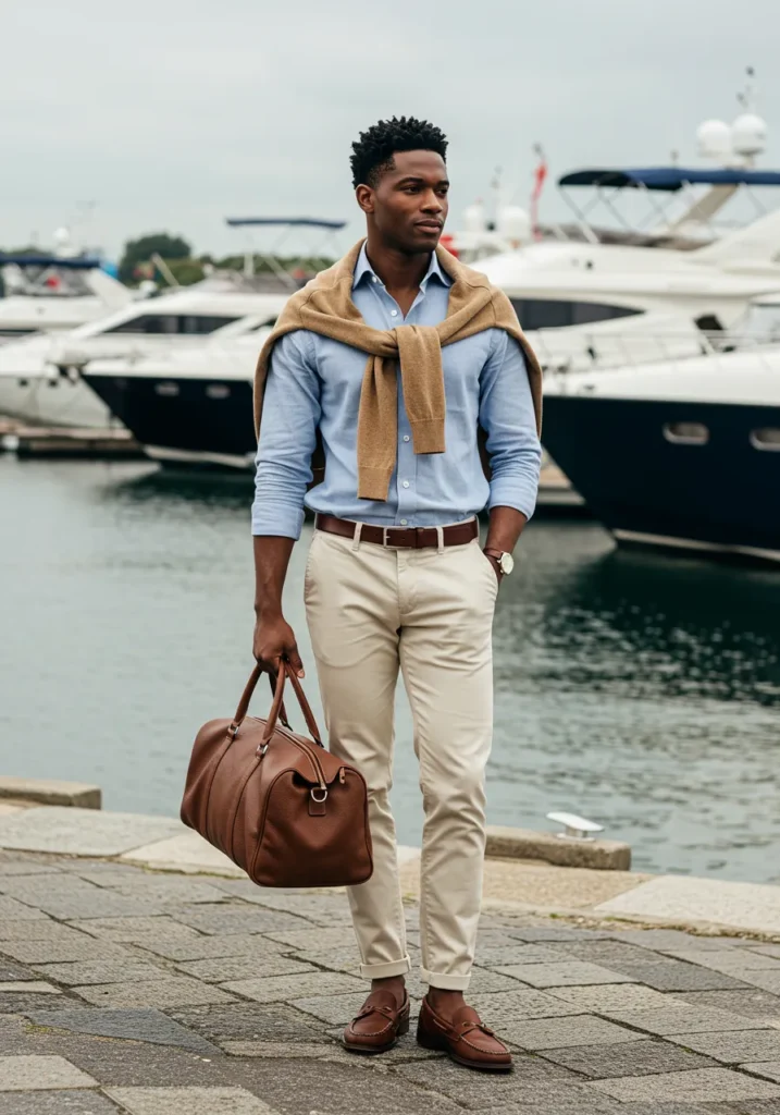 This outfit is coastal chic done right. A light blue button-down is paired with cream chinos and brown loafers, finished off with a tan sweater draped casually over the shoulders. The leather duffel bag adds a practical yet elevated element, making the whole look polished but relaxed.
