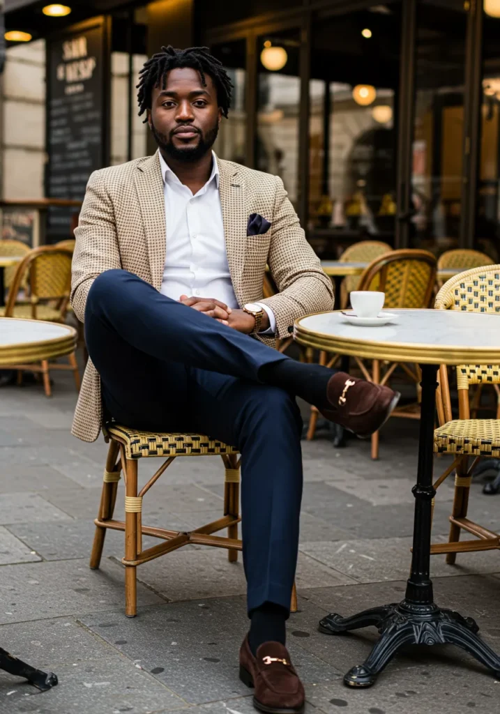 Here’s a perfect blend of relaxed and refined. A beige checkered blazer sits over a crisp white shirt, paired with navy trousers and suede loafers. A pocket square peeks out just enough to add polish, while the setting of a Parisian café makes the look feel straight out of a style magazine.
