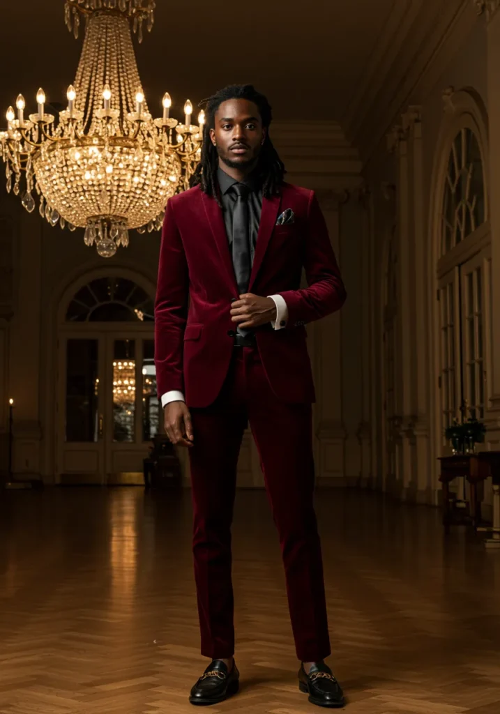This look is pure drama in the best way possible. The deep burgundy velvet suit is cut sharp and sleek, paired with a black shirt and matching tie that give it a moody, modern edge. The addition of black loafers with subtle gold details and a neatly folded pocket square makes the whole outfit feel refined yet daring. The chandelier backdrop only amplifies the regal effect.