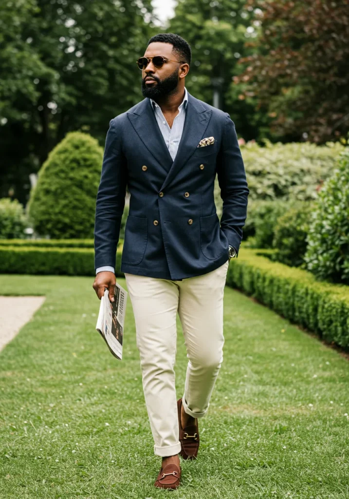 Here we have a classic double-breasted navy blazer styled with a striped shirt, cream trousers, and loafers. The patterned pocket square adds personality, and the sunglasses give it that polished edge. Holding a newspaper while strolling through a garden makes the whole look feel straight out of an old money lifestyle snapshot.