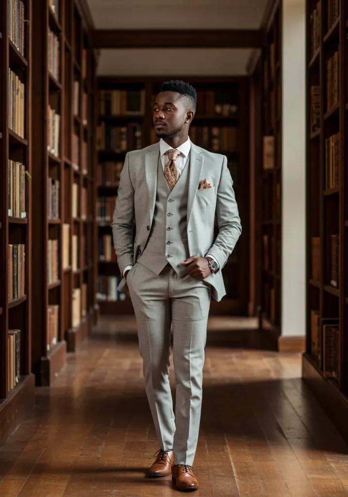 This three-piece grey suit is sophistication at its peak. The tailoring is sharp, the patterned tie adds a pop of personality, and the pocket square ties it all together. Brown leather shoes finish the look, while the library setting brings out the sense of culture and intellect.