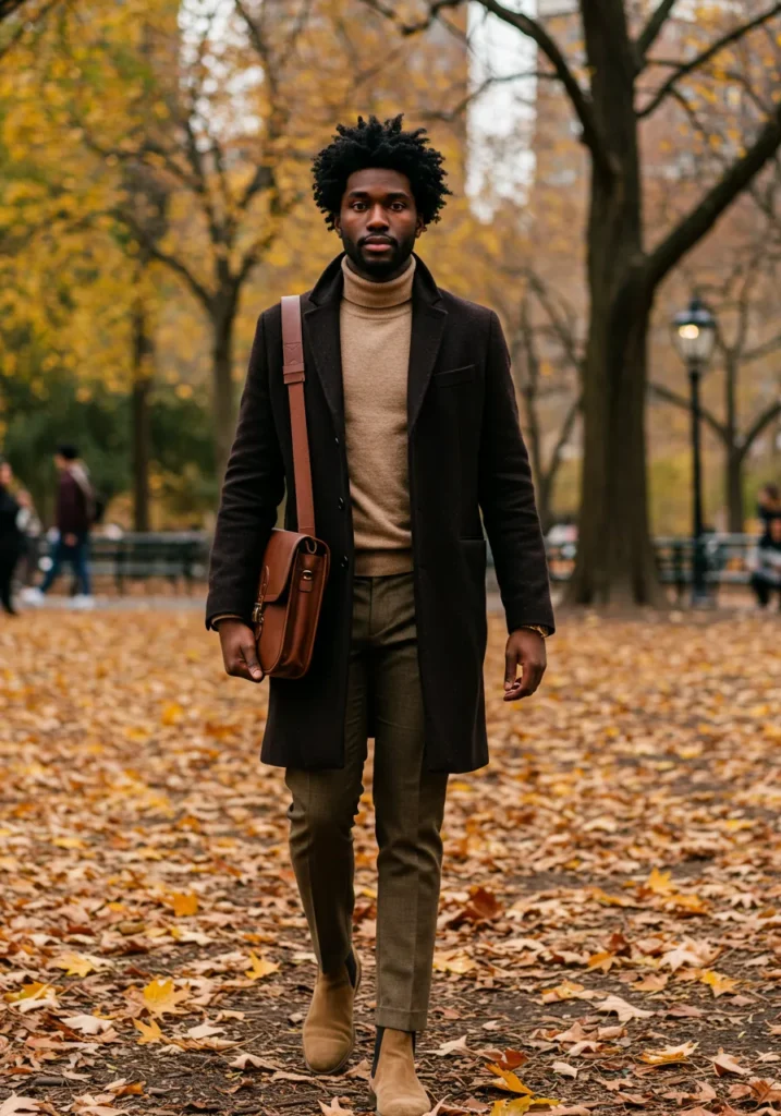 Here we see a deep brown overcoat layered over a beige turtleneck, paired with tailored trousers and suede Chelsea boots. The earthy tones blend beautifully with the autumn leaves, while the structured cut of the coat and the leather satchel bring refined practicality. It’s understated, yet powerful in its simplicity.
