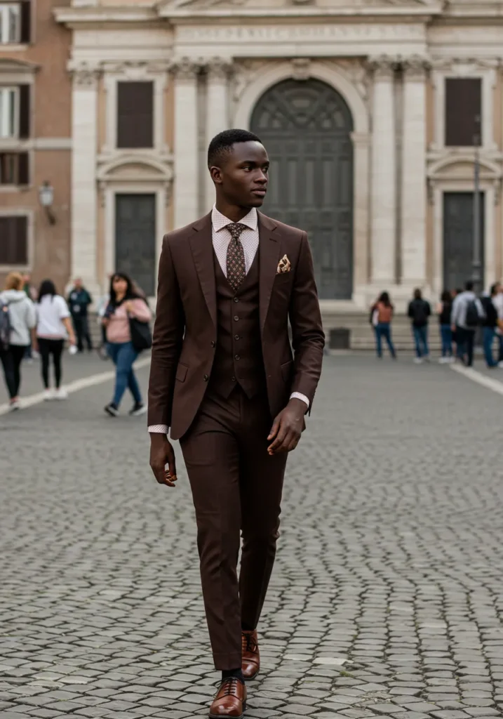 This outfit is a deep brown three-piece suit paired with a patterned tie and crisp white shirt. Polished leather shoes and a silk pocket square finish the look, while the cobbled square and historic buildings in the background create an old-world heritage vibe.
