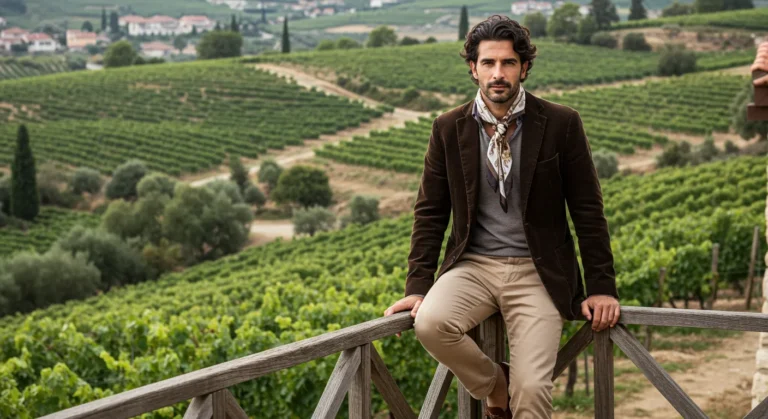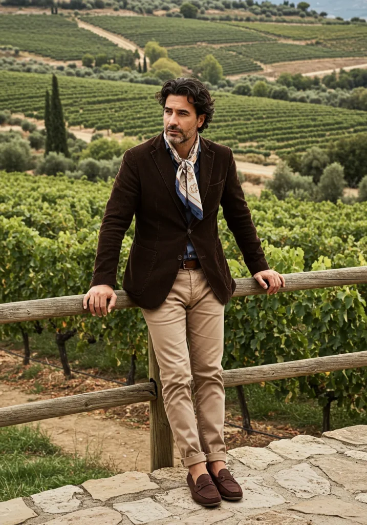 Here we have a dark brown corduroy blazer layered over a blue shirt, paired with beige trousers and loafers. A patterned silk scarf tied around the neck adds flair, while the vineyard backdrop completes the heritage aesthetic.