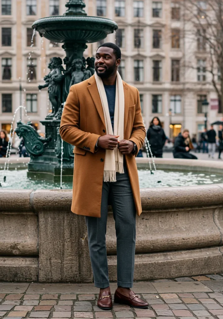 This look highlights a camel overcoat worn over a navy sweater and paired with grey tailored trousers. A cream scarf draped around the neck adds contrast, while the brown loafers finish everything with polish. The fountain and city backdrop make it feel cosmopolitan yet timeless.