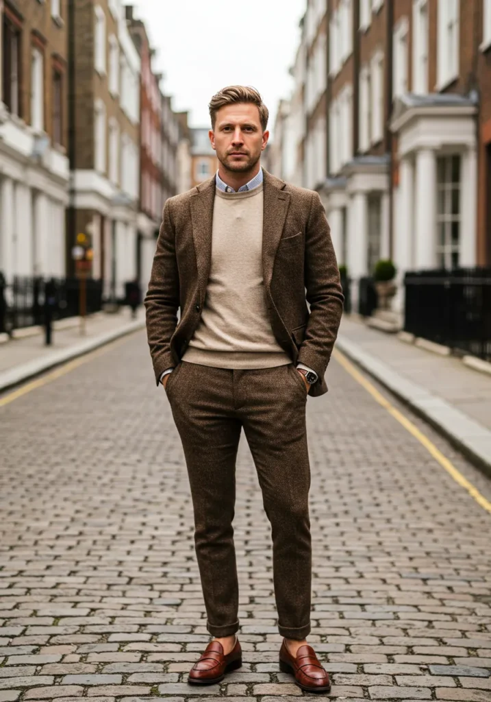 This outfit features a textured brown tweed suit styled with a cream sweater layered over a light blue shirt. The trousers are slim and neat, and the look is finished with polished brown loafers. The cobblestone street backdrop makes the outfit feel even more heritage-inspired.