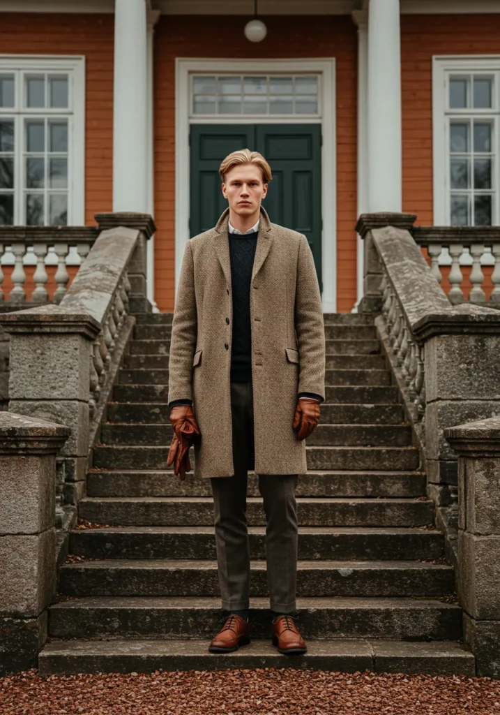 This outfit features a taupe wool overcoat layered over a navy sweater and white shirt, paired with tailored trousers and leather shoes. Brown leather gloves and a matching bag complete the look, giving it a distinguished country estate feel. The muted tones create quiet sophistication.