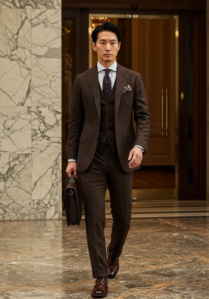 I love how sleek and powerful this outfit feels. It’s refined, serious, and perfectly suited for a man who wants to look confident without being flashy. The deep brown color feels grounded and commanding, making it a timeless old money choice.