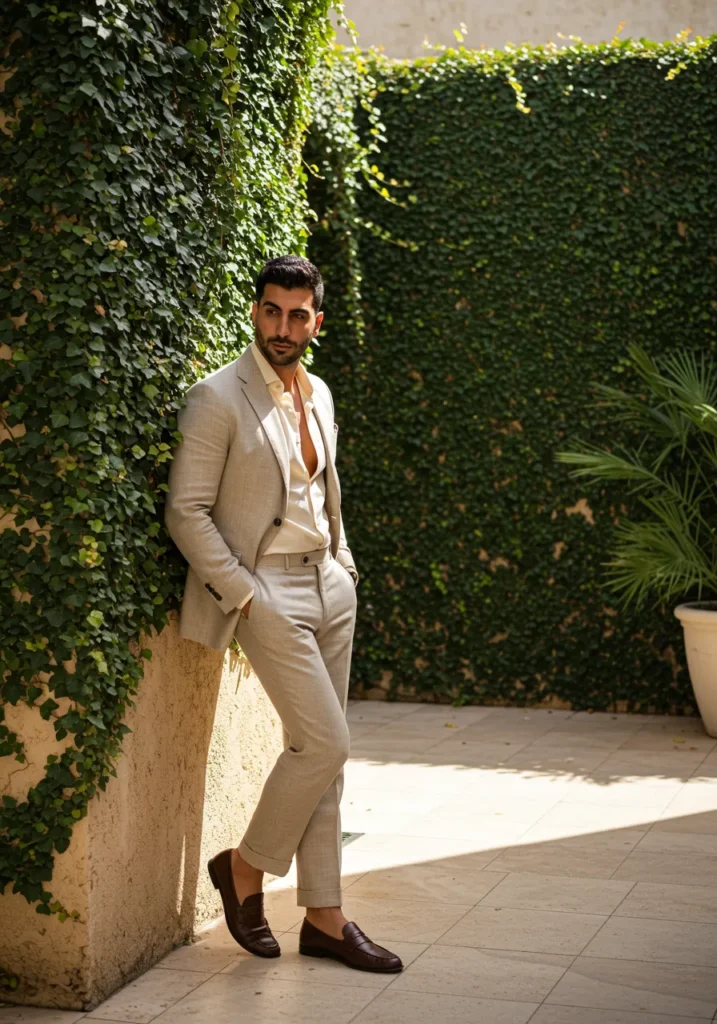 This outfit features a light beige suit with a modern tailored cut, worn effortlessly without a tie. The unbuttoned shirt gives it a relaxed vibe, while the rolled-up trousers paired with brown loafers add just the right amount of casual elegance. The whole look is softened by the warm tones of the setting, creating a timeless Mediterranean charm.