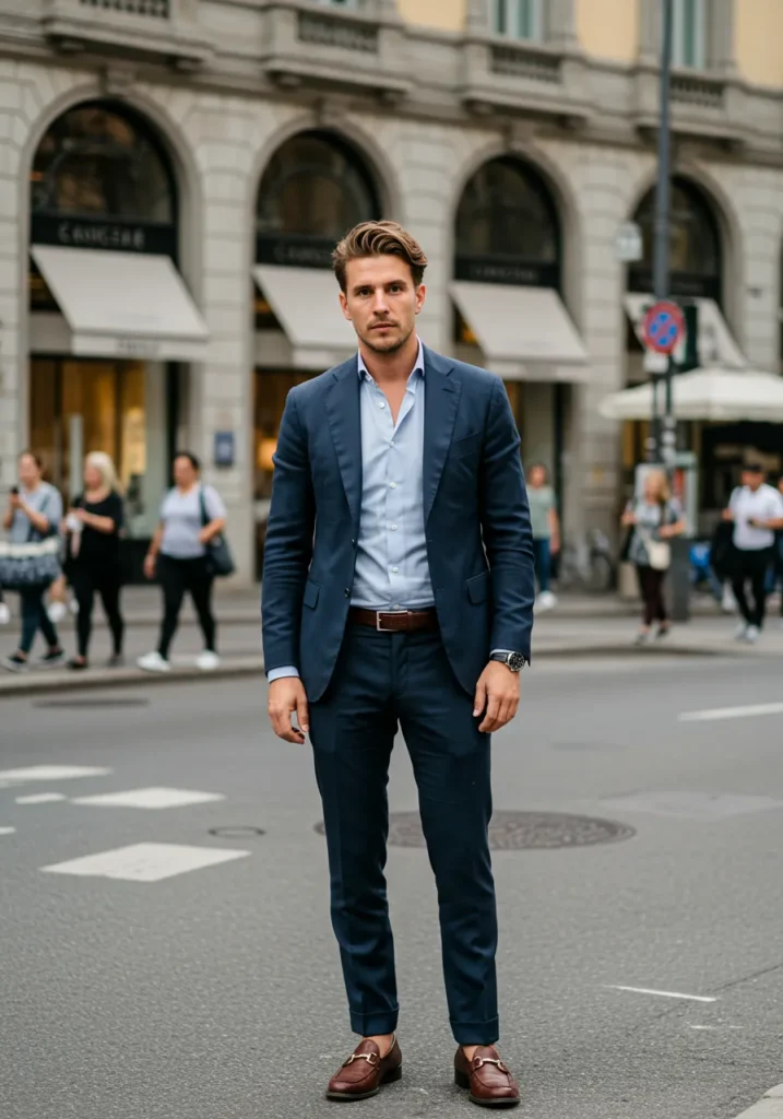 Here we have a tailored navy suit worn with a crisp light blue shirt, perfectly styled with a slim leather belt and glossy brown loafers. The structured cut of the jacket and trousers makes the whole outfit sleek, and the simple color pairing keeps it classic while feeling modern.