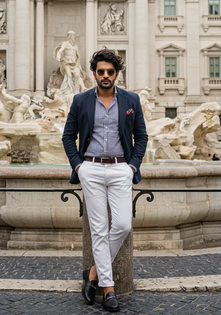This look features a navy blazer worn over a striped dress shirt, paired with white trousers and black loafers. The pocket square and sunglasses bring in extra personality, and the fountain backdrop sets the perfect Italian scene.