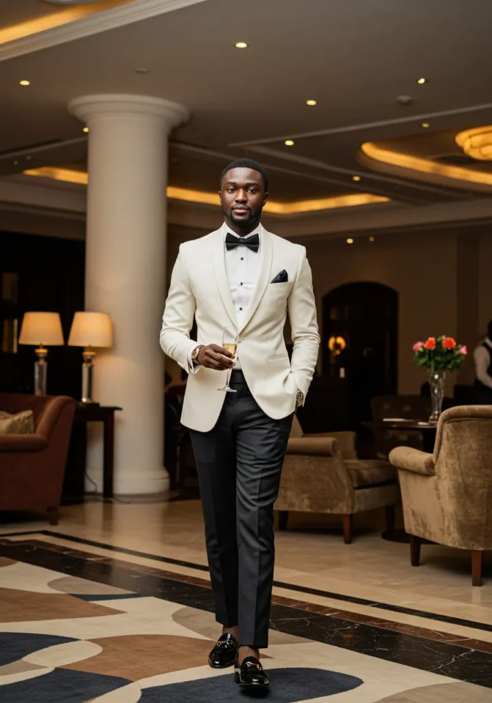 This formal outfit stuns with a white dinner jacket paired with black trousers, a bow tie, and glossy black loafers. The champagne glass and hotel lobby backdrop make it feel luxuriously elegant.