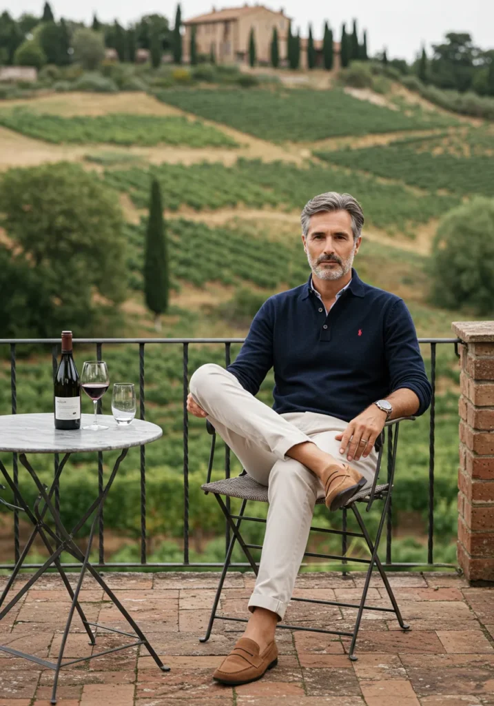 This look keeps things crisp and relaxed with a navy long-sleeve polo paired with cream trousers and tan loafers. The clean lines and simple colors make it timeless, and the vineyard backdrop gives the whole look a polished Tuscan charm.