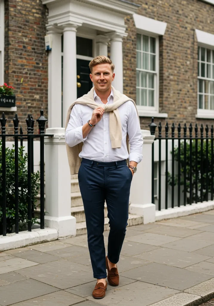 This outfit is all about easy sophistication, pairing a white shirt tucked into slim navy trousers with brown loafers. The extra detail of a beige sweater draped casually over the shoulders instantly gives it that preppy, polished energy.