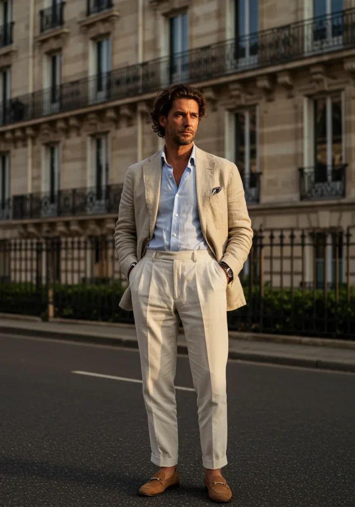 Here the look leans into warm weather refinement, with a soft beige blazer layered over a light blue shirt, paired with pleated cream trousers and tan loafers. The fabrics are lightweight and breathable, but the structure of the tailoring keeps it sharp.