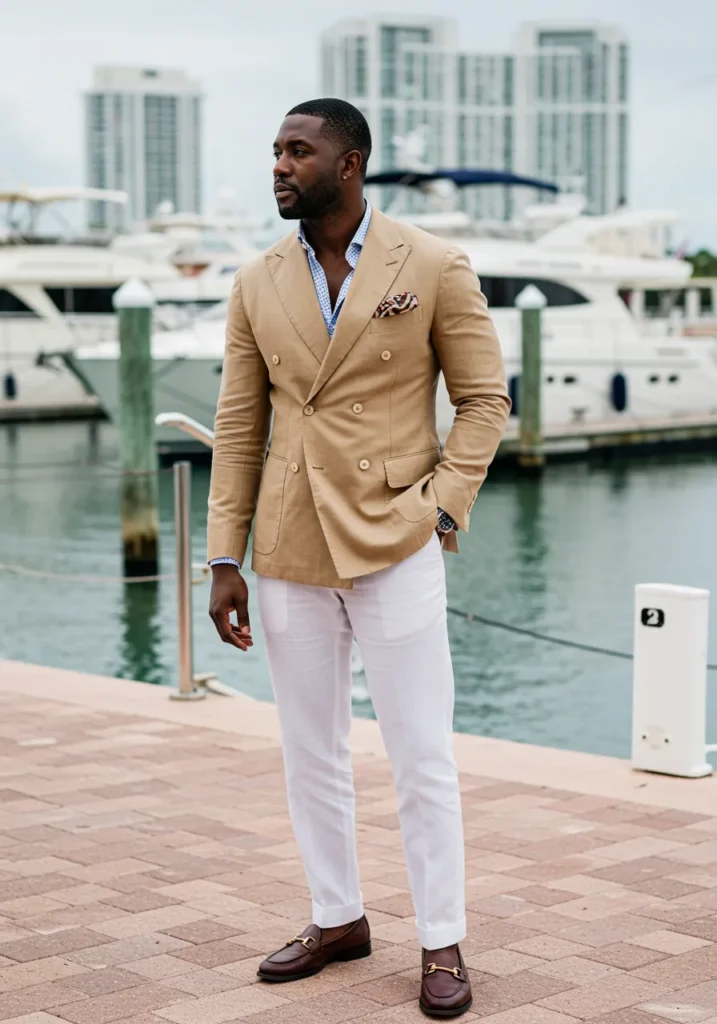 I can’t help but smile at how fresh and luxe this looks. The contrast between the camel jacket and white pants is bold but still classic, and those loafers make the outfit feel anchored in tradition. It’s the kind of look that just works perfectly by the water.