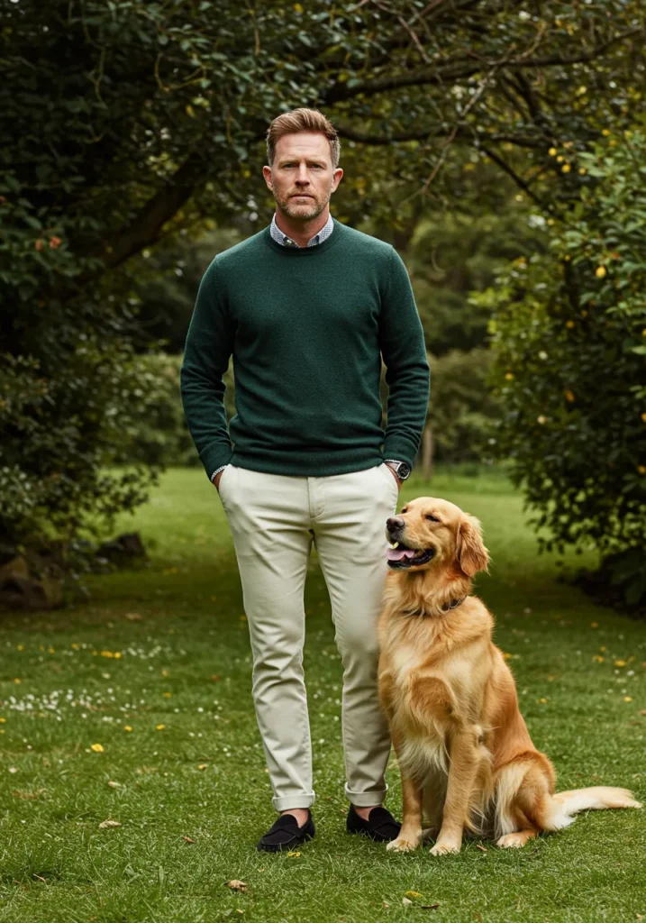 This look feels timeless and grounded, pairing a forest green crewneck sweater over a patterned button-down with cream trousers and dark loafers. The outfit leans into understated elegance, set against a lush green garden backdrop with a golden retriever by his side that makes the whole vibe extra charming.