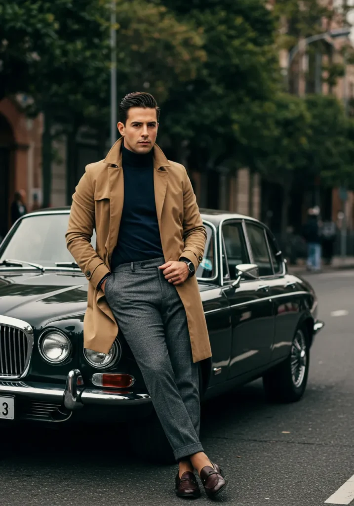 Here we see a camel trench coat layered over a dark turtleneck and grey tailored trousers, styled with polished brown loafers. The mix of classic tailoring and sharp neutrals creates a bold city look, especially leaning against a vintage car.